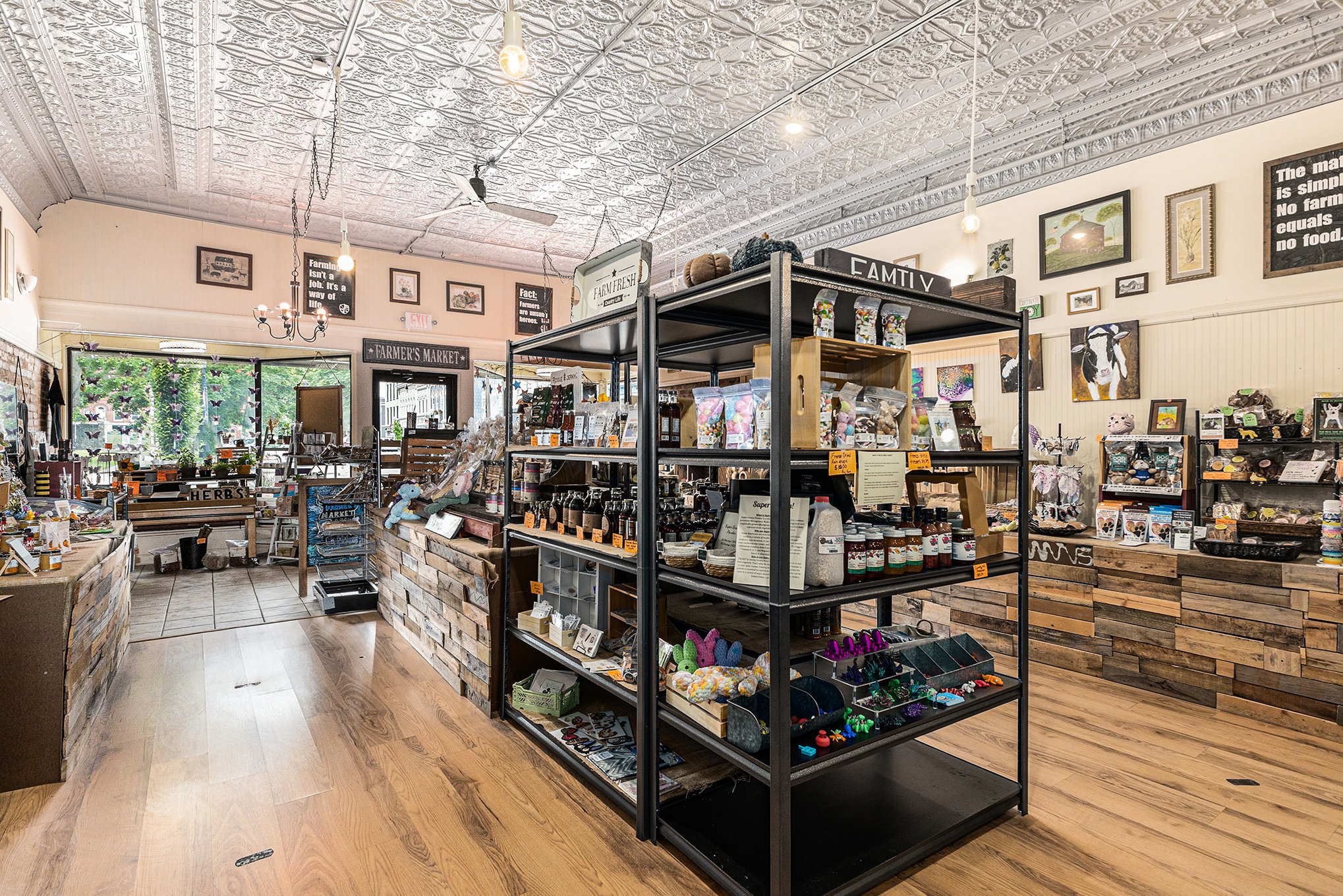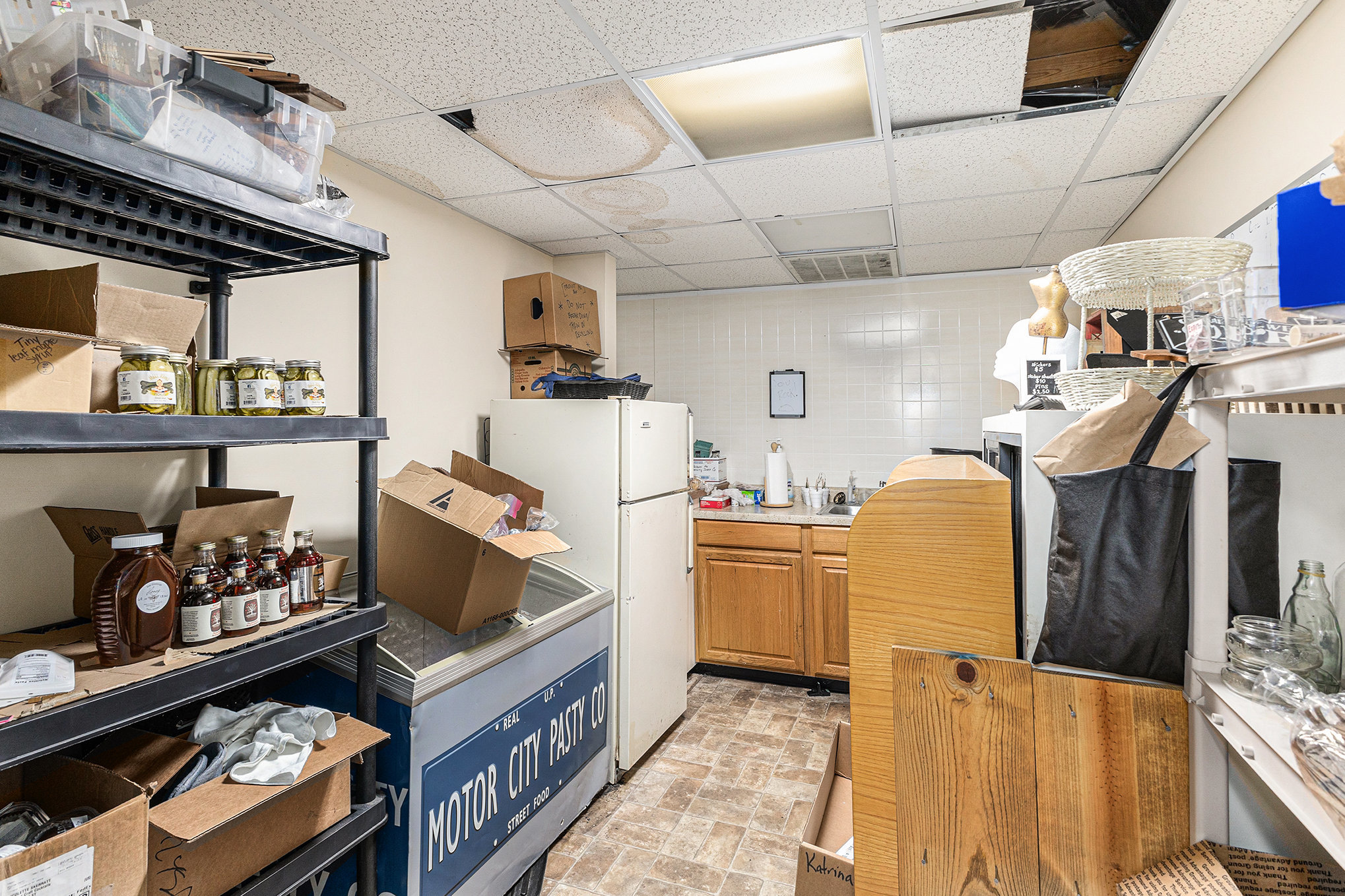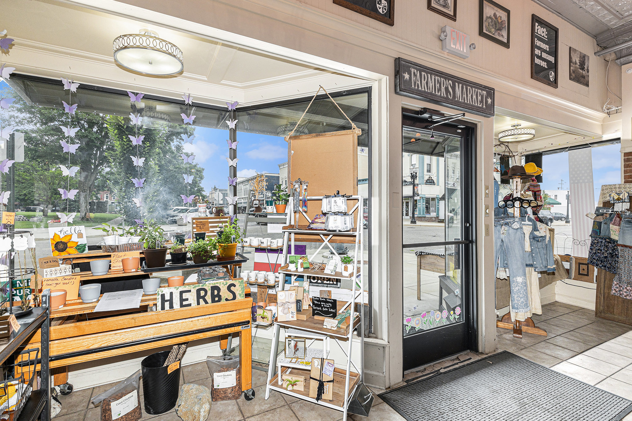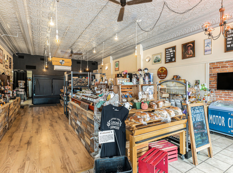 Charming two-story brick façade with large, street-facing display windows invite passersby into the retail space.