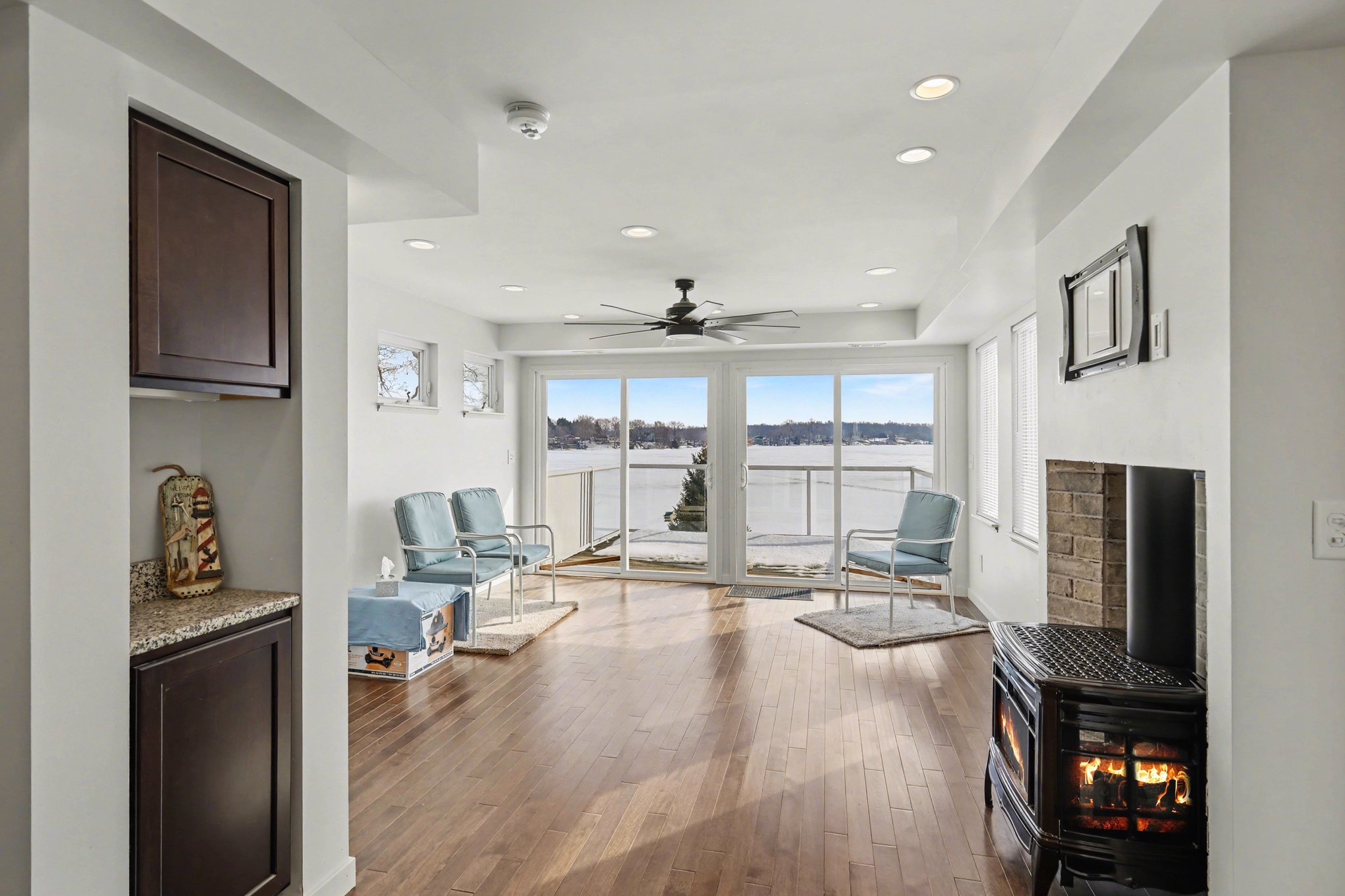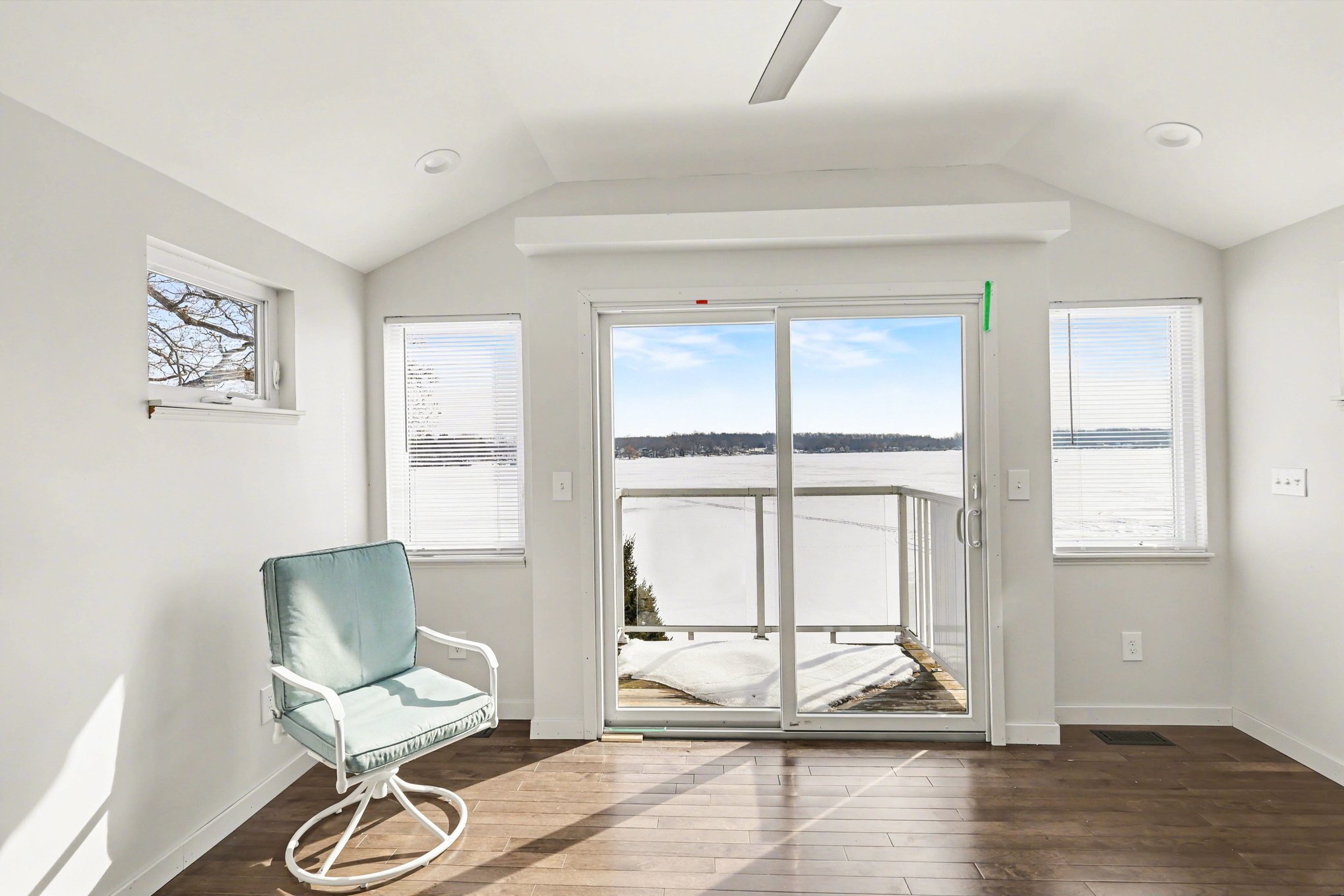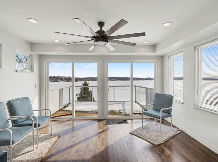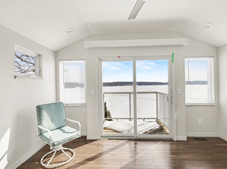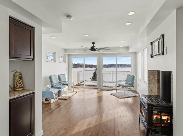 The main level offers a spacious living room with two sliding glass doors that lead to the expansive deck—seamlessly blending indoor and outdoor living with picturesque lake views.