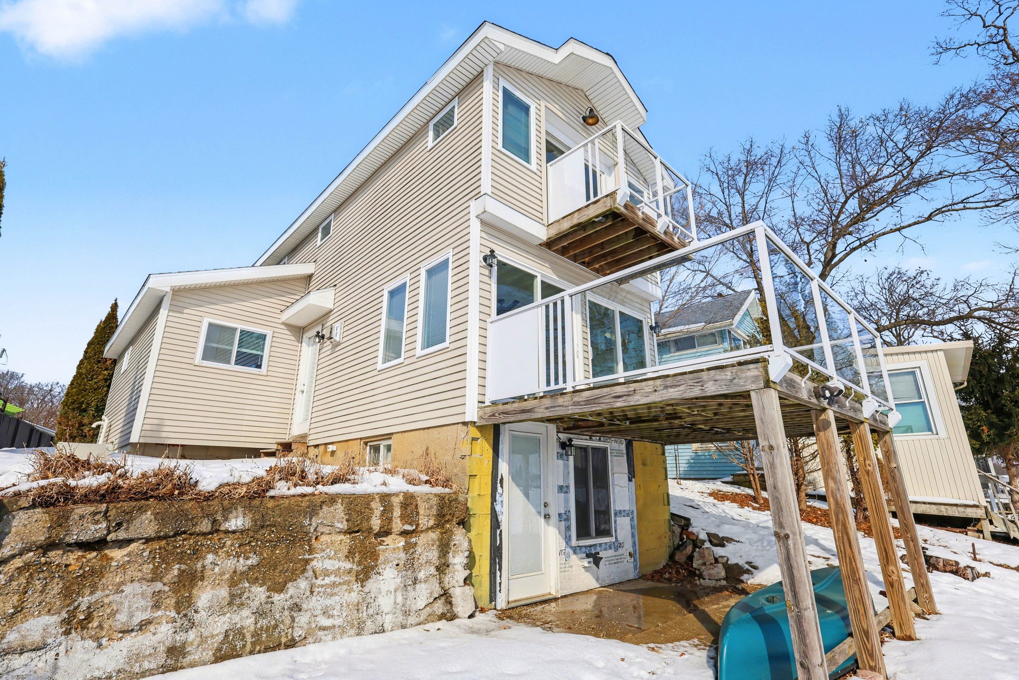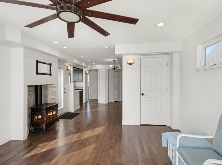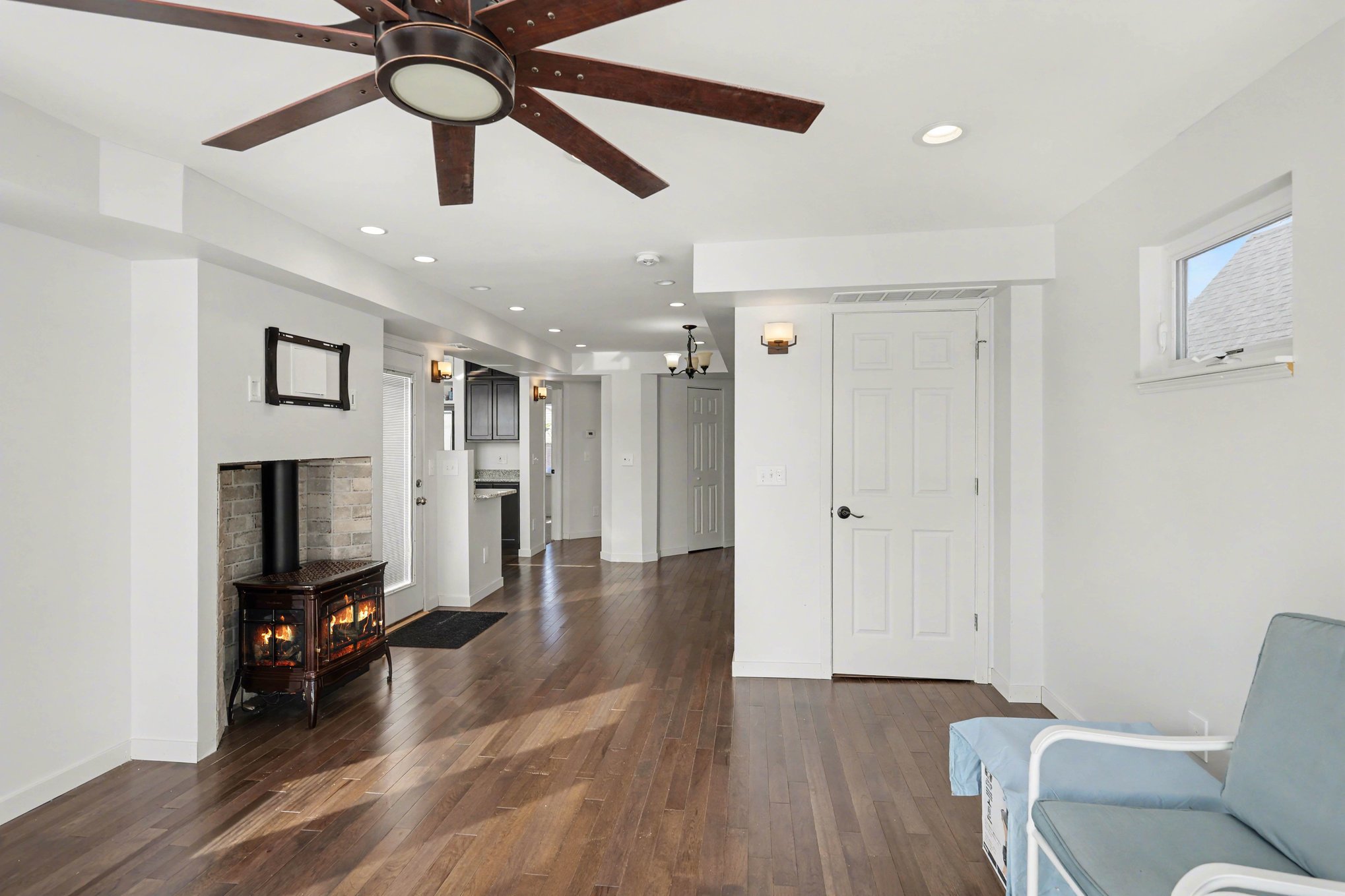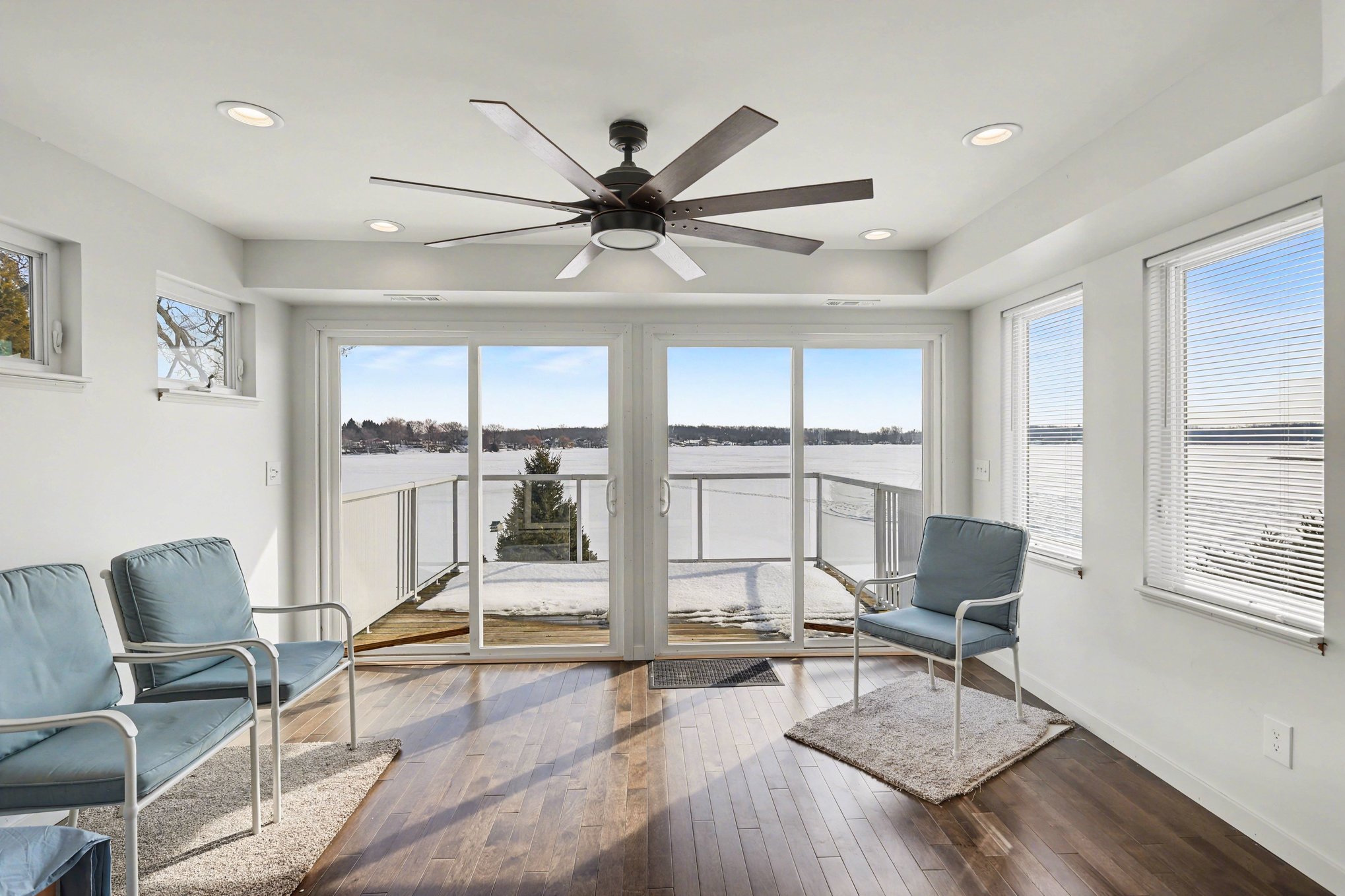 The main level offers a spacious living room with two sliding glass doors that lead to the expansive deck—seamlessly blending indoor and outdoor living with picturesque lake views.