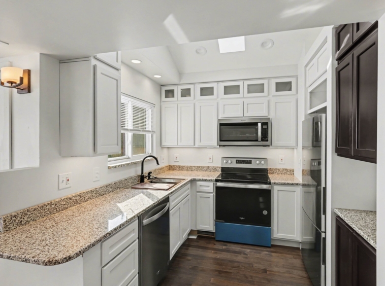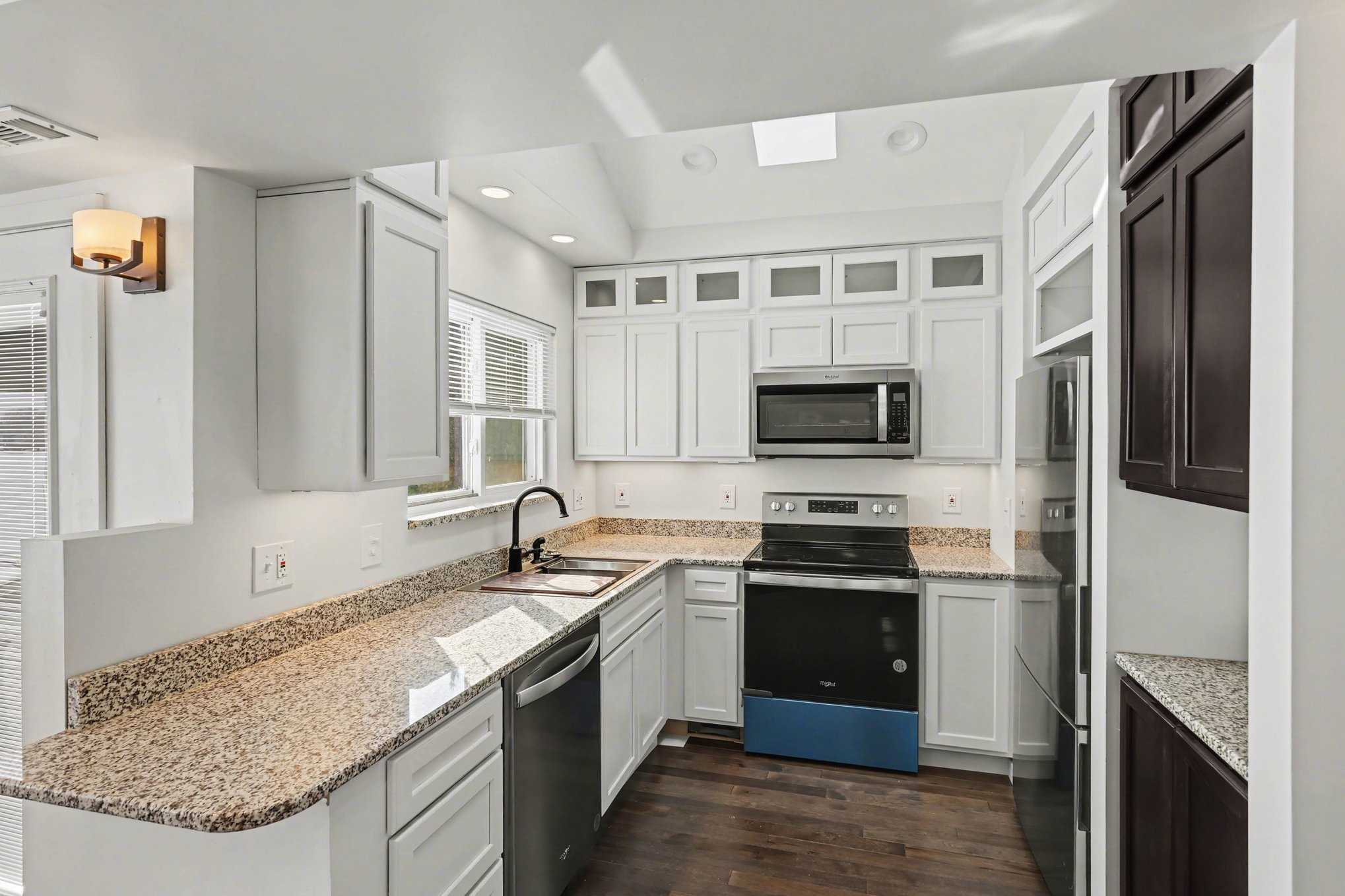The sparkling new kitchen features ample counter space and modern finishes, perfect for all your cooking and hosting needs.