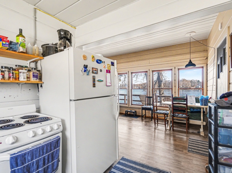 Open floor plan with an efficient kitchen, dining room, and living room with gorgeous views overlooking the lake.